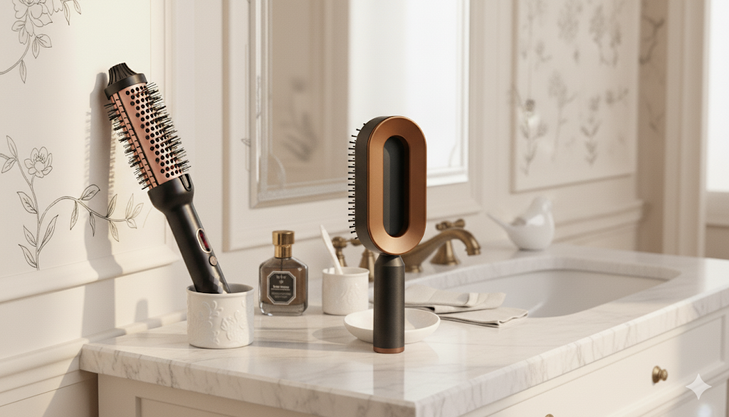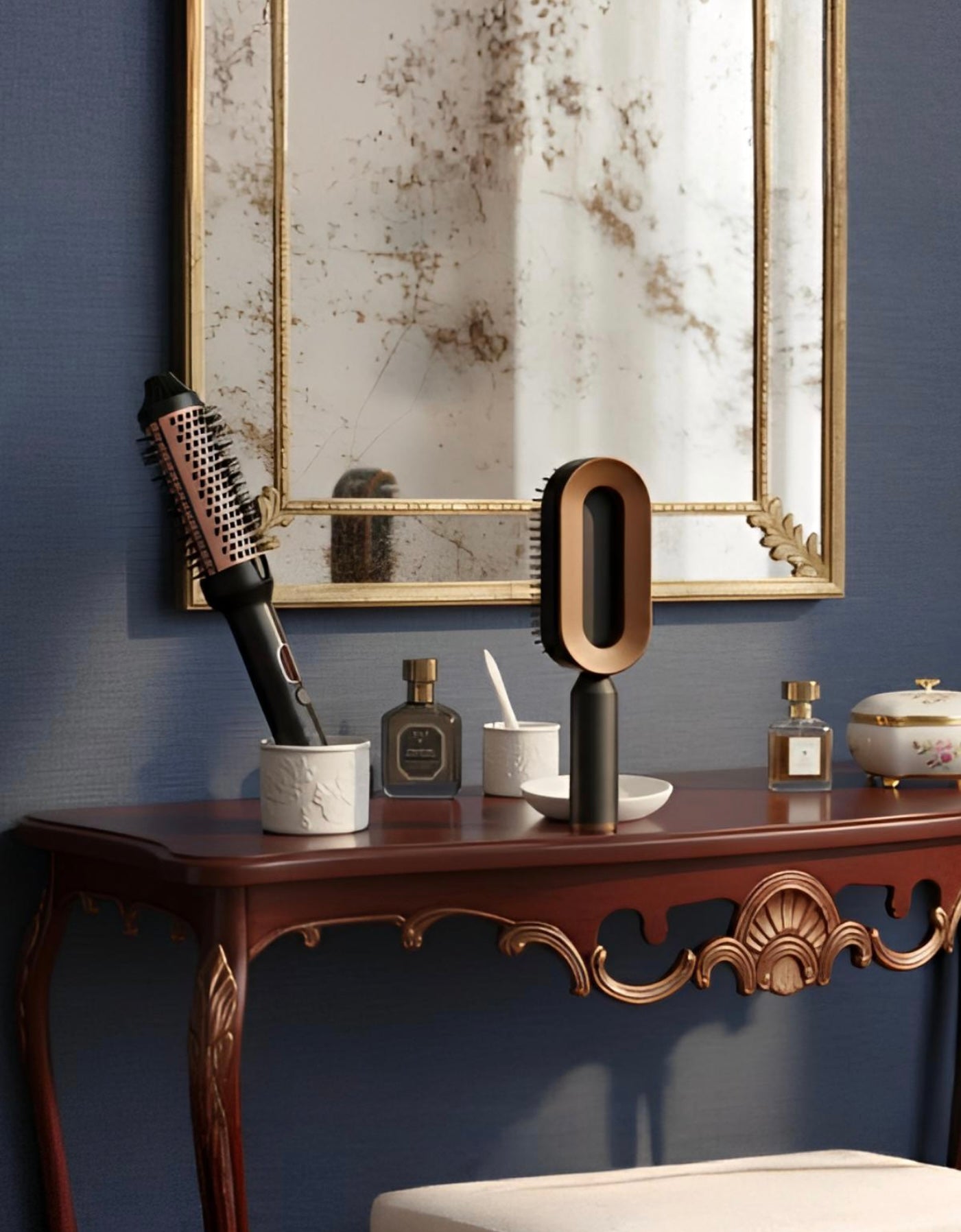 double the delight pairs our self-cleaning SwiftClean© Brush with the Ionic Blowout Brush© to turn everyday hair into glossy, frizz-tamed volume in minutes. First, glide through to detangle while the brush auto-clears loose strands; then smooth, lift, and set with salon-level ions for bounce that lasts.